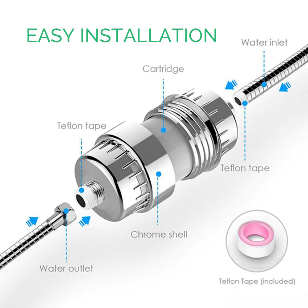 Installa questo filtro per soffione doccia per acqua dura in modo semplice e autonomo. Non sono necessari attrezzi, basta un raccordo a mano e un po' di nastro adesivo da idraulico incluso. Nessuna perdita, nessuna crepa. Adatto a soffioni doccia a parete, portatili, a pioggia e combinati!
